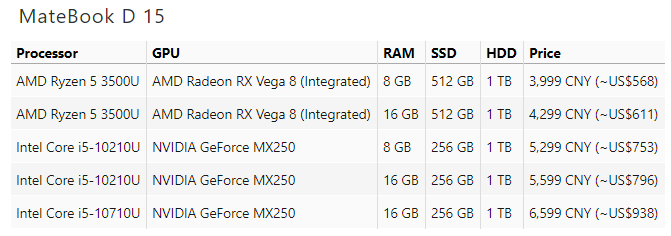 لپتاپهای جدید هوآوی سری Matebook D در دو مدل ۱۴ و ۱۵ اینچی که به ترتیب ۲۵۶ و ۵۱۲ گیگابایت فضای ذخیرهسازی داخلی دارند، معرفی شدند. بهروزرسانیهای قابل توجه در این دو محصول، استفاده از پردازندههای AMD Ryzen 5 3500U در مقایسه با مدل AMD Ryzen 2500U است. در حالی که پردازشگر گرافیکی Radeon RX Vega 8 نیز در این دو محصول استفاده شده.