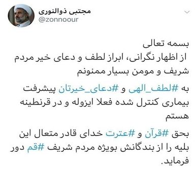 گروه سیاسی الف، 3981213102حجت الاسلام و المسلمین ذوالنور در صفحه شخصی خود نوشت: از اظهار نگرانی، ابراز لطف و دعای خیر مردم شریف و مومن بسیار ممنونم. به لطف الهی و دعای خیرتان پیشرفت بیماری کنترل شده و فعلا ایزوله و در قرنطینه هستم.