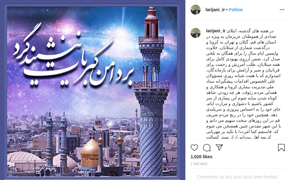 متن کامل پست اینستاگرامی لاریجانی به این شرح است: "در هفته های گذشته، ابتلای تعدادی از هموطنان عزیزمان به ویژه در استان های قم، گیلان و تهران به کرونا و درگذشت شماری از مبتلایان، حلاوت واپسین ایام سال را برای همگان به تلخی مبدل کرد. ضمن آرزوی بهبودی کامل برای همه مبتلایان، طلب آمرزش و رحمت برای قربانیان و صبر و آرامش برای بازماندگان، امیدوارم که با همت شبانه روزی مسئولان علی الخصوص اقدامات پیشگیرانه ستاد ملی مدیریت بیماری کرونا و همکاری و همدلی مردم رئوف، هر چه زودتر، شاهد کوتاه شدن سایه شوم این بیماری از سر کشور باشیم تا دشواری و مرارت ایام، جای خود را به احساس پیروزی و سربلندی دهد. همچنین خود را در رنج مردم شریف قم در این روزهای سخت سهیم می دانم و با این شهر مقدس چنین همسخن می شوم که: فَاسْتَقِمْ کَمَا أُمِرْتَ! با تکیه بر مهربانی کریمه اهل بیت(س)، از بستر کسالت برخیز! این روزها می گذرد و می دانم که بر دامنت کبریات ننشیند گرد."