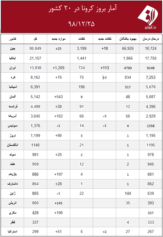 3981225126این روزها ویروس کرونا در اغلب کشورهای جهان در حال گسترش است و تکاپویی جهانی برای کنترل آن شکل گرفته است. شما می توانید هر روز در جدول زیر روند ابتلا به این بیماری و بهبود آن را در کشورهای مختلف ببینید. جدول زیر متعلق به امروز یکشنبه ۲۵ اسفند است.
