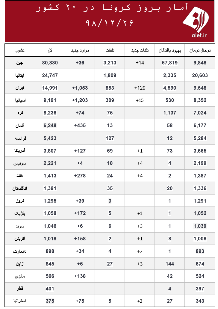 محمدسجاد بهرامی، گروه عکس الف، 3981226130 ۰ نظر، ۰ در صف انتشار و ۱ تکراری یا غیرقابل انتشاراین روزها ویروس کرونا در اغلب کشورهای جهان در حال گسترش است و تکاپویی جهانی برای کنترل آن شکل گرفته است. شما می توانید هر روز در جدول زیر روند ابتلا به این بیماری و بهبود آن را در کشورهای مختلف ببینید. جدول زیر متعلق به امروز دوشنبه ۲۶ اسفند است.