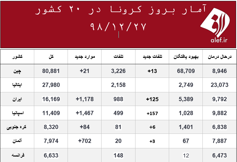 3981227125 ۰ نظر، ۰ در صف انتشار و ۱ تکراری یا غیرقابل انتشاراین روزها ویروس کرونا در اغلب کشورهای جهان در حال گسترش است و تکاپویی جهانی برای کنترل آن شکل گرفته است. شما می توانید هر روز در جدول زیر روند ابتلا به این بیماری و بهبود آن را در کشورهای مختلف ببینید. جدول زیر متعلق به امروز سه شنبه ۲۷ اسفند است.