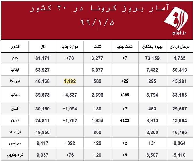 3990105066این روزها ویروس کرونا در اغلب کشورهای جهان در حال گسترش است و تکاپویی جهانی برای کنترل آن شکل گرفته است. شما می توانید هر روز در جدول زیر روند ابتلا به این بیماری و بهبود آن را در کشورهای مختلف ببینید. جدول زیر متعلق به امروز ۵ فروردین است.