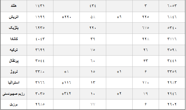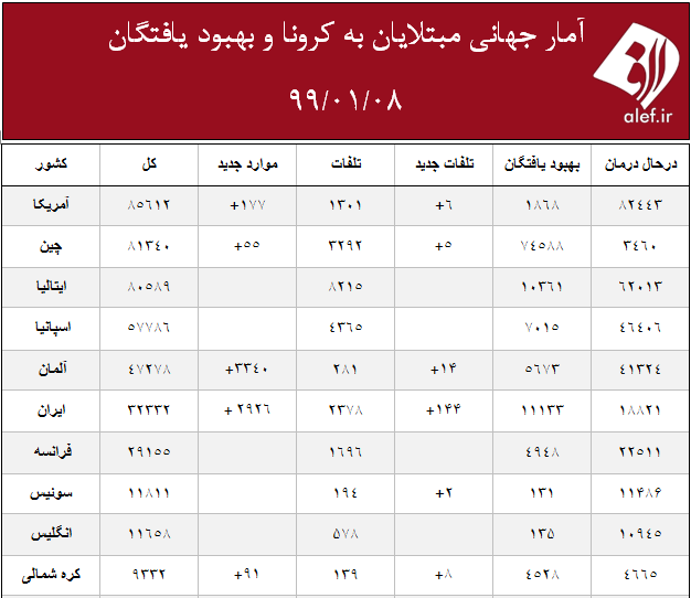 گروه سلامت الف، 3990108086 ۲ نظر، ۰ در صف انتشار و ۰ تکراری یا غیرقابل انتشارویروس کرونا به سرعت در جهان غرب و بخصوص درآمریکا در حال گسترش است به گونه ای که آمریکا در صدر جدول بیشترین مبتلایان به کرونا قرار گرفته است. شما می توانید هر روز در جدول زیر روند ابتلا به این بیماری و بهبود آن را در کشورهای مختلف ببینید. جدول زیر متعلق به امروز هشتم فروردین است.