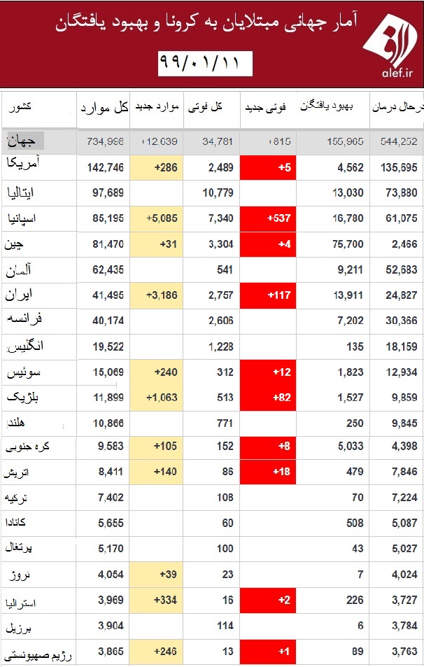 گروه سلامت الف، 3990111073آمار مبتلایان به کرونا در جهان از مرز ۷۰۰هزار نفر عبور کرد و این ویروس به سرعت در جهان غرب و بخصوص درآمریکا در حال گسترش است. شما می توانید هر روز در جدول زیر روند ابتلا به این بیماری و بهبود آن را در کشورهای مختلف ببینید. آمریکا بیشترین ابتلا و اسپانیا بیشترین فوتی ها را داشته است . جدول زیر متعلق به امروز یازدهم فروردین است.