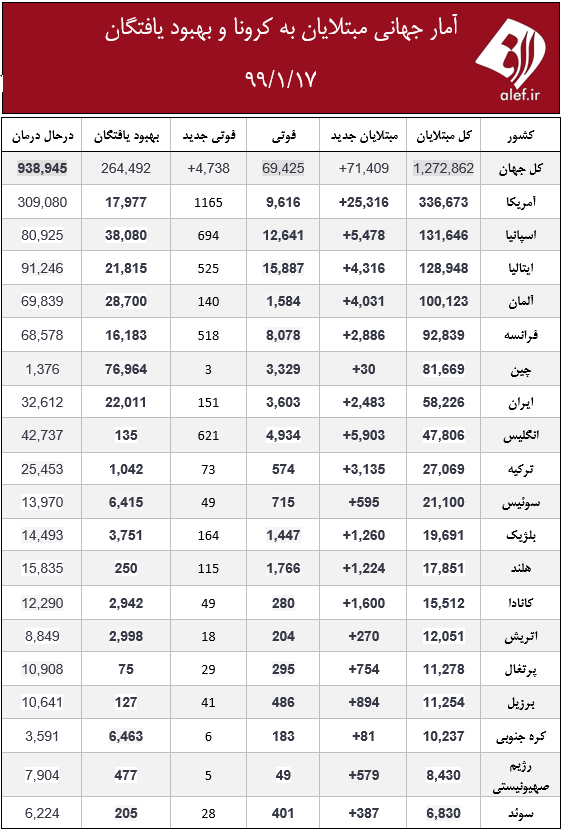 3990118053این روزها ویروس کرونا در اغلب کشورهای جهان در حال گسترش است و تکاپویی جهانی برای کنترل آن شکل گرفته است. شما می توانید هر روز در جدول زیر روند ابتلا به این بیماری و بهبود آن را در کشورهای مختلف ببینید. جدول زیر متعلق به ۱۷ فروردین است.