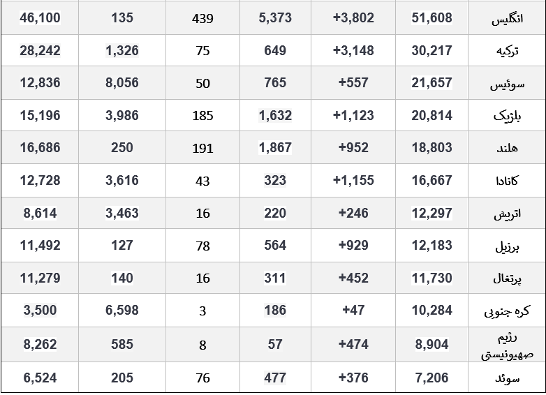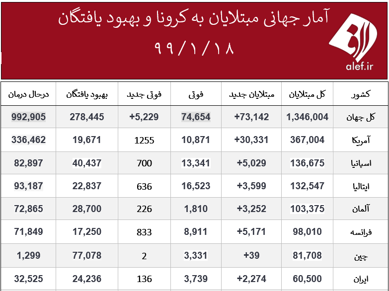گروه سلامت الف، 3990119061این روزها ویروس کرونا در اغلب کشورهای جهان در حال گسترش است و تکاپویی جهانی برای کنترل آن شکل گرفته است. شما می توانید هر روز در جدول زیر روند ابتلا به این بیماری و بهبود آن را در کشورهای مختلف ببینید. جدول زیر متعلق به ۱۸ فروردین است.