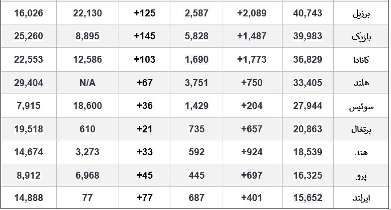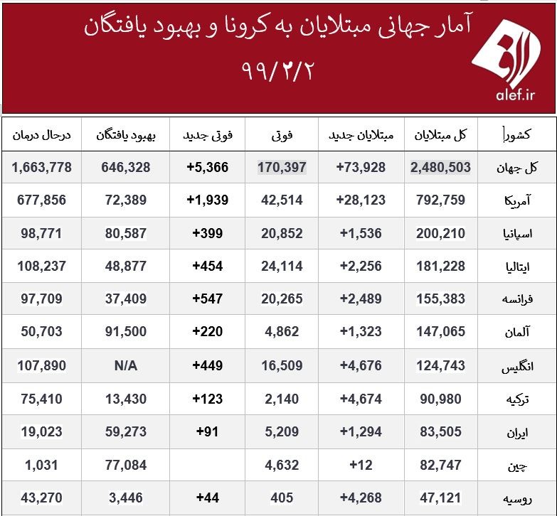 گروه سلامت الف، 3990202039این روزها ویروس کرونا در اغلب کشورهای جهان در حال گسترش است و تکاپویی جهانی برای کنترل آن شکل گرفته است. شما می توانید هر روز در جدول زیر روند ابتلا به این بیماری و بهبود آن را در کشورهای مختلف ببینید. جدول زیر متعلق به ۲ اردیبهشت است.