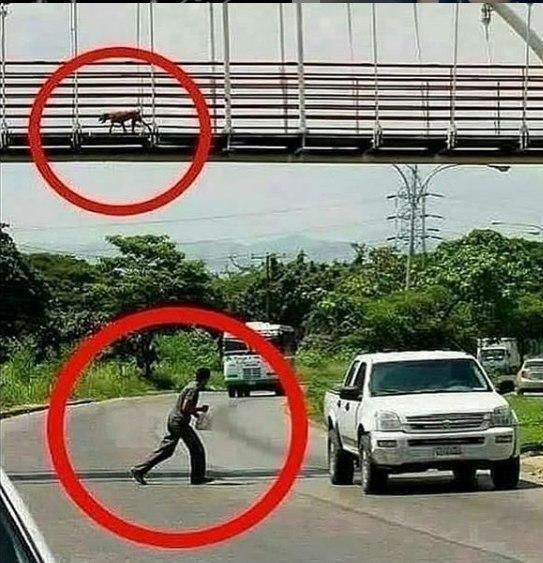 مرد پیاده صاحب ماشین پارک شده است و در حال برگشتن به اتومبیل لذا لزومی ندارد برای عبور از پل استفاده کند بیشتر اوقات رسانه ها با در کنار هم قرار دادن بعضی تضادها حقیقت را پنهان می کنند این تصویر شاهد خوبی است