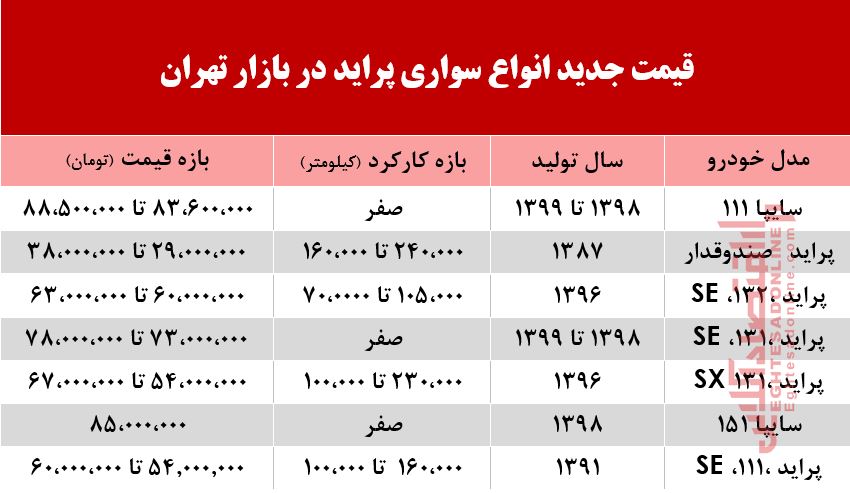 اقتصاد آنلاین نوشت: آنچه در زیر میآید قیمت روز انواع سواری پراید در سطح بازار پایتخت در اردیبهشت ماه ۹۹ بدست آمده است.