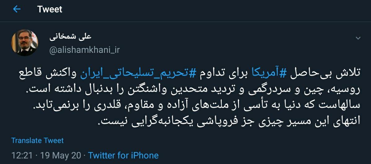 گروه سیاسی الف، 3990230101دبیر شورای عالی امنیت ملی کشورمان طی توئیتی نوشت: «تلاش بیحاصل آمریکا برای تداوم تحریم تسلیحاتی ایران واکنش قاطع روسیه، چین و سردرگمی و تردید متحدین واشنگتن را به دنبال داشته است. سالهاست که دنیا به تأسی از ملتهای آزاده و مقاوم، قلدری را برنمیتابد»، اظهار داشت: «انتهای این مسیر چیزی جز فروپاشی یکجانبهگرایی نیست.»