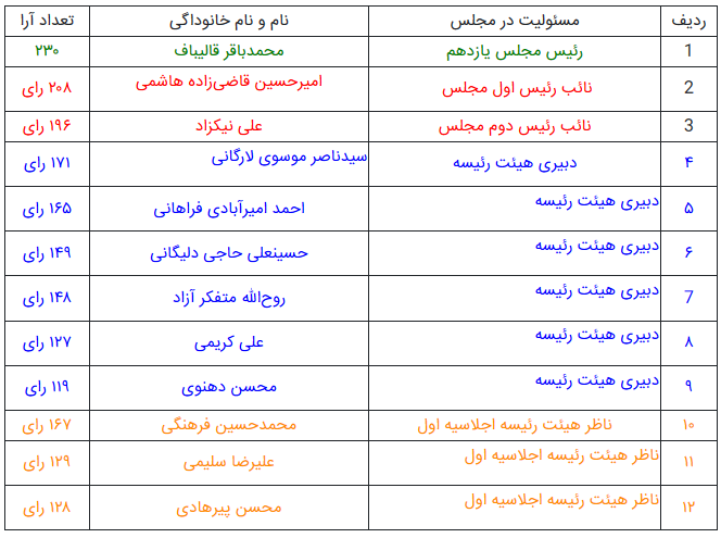 با توجه به انتخاباتی که امروز در صحن مجلس برگزار شد، هیئت رئیسه پارلمان یازدهم برای یکسال به شرح زیر از سوی وکلای ملت انتخاب شدند: