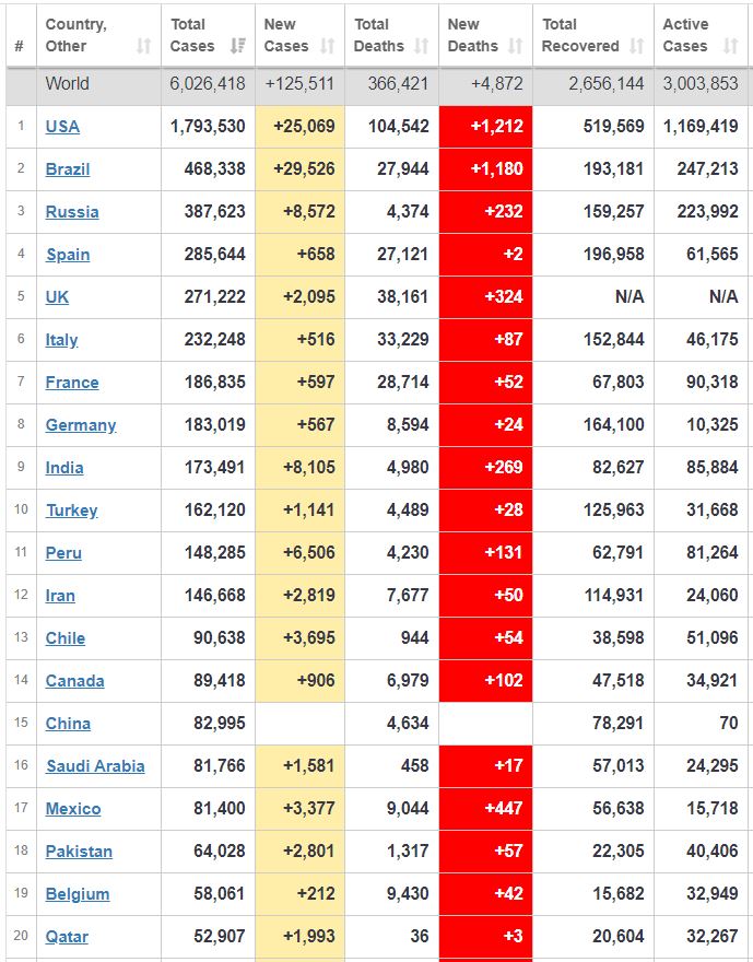 آمار بهروز جهانی درباره کرونا/ آمریکا و برزیل بیش از ۱۰ هزار مبتلا
