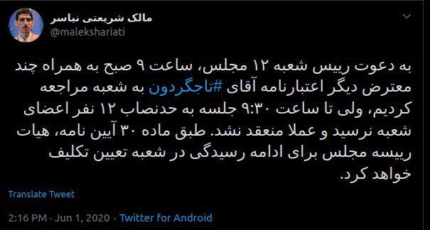 گروه سیاسی الف، 3990312102در حالی که برخی نمایندگان پارلمان از برگزاری جلسه بررسی اعتبارنامه تاجگردون در شعبه ۱۲ خبر میدهند اما، مالک شریعتی نماینده مردم تهران در مجلس شورای اسلامی در توئینی اعلام کرد: جلسه بررسی اعتبارنامه تاجگردون به علت به حد نصاب نرسیدن برگزار نشد.