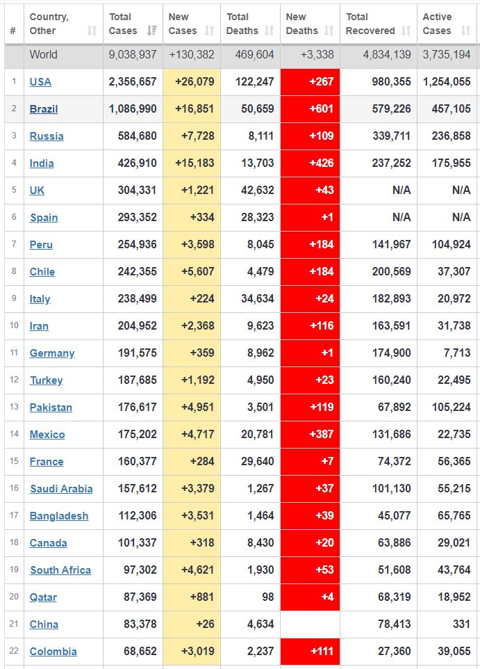 گروه سلامت الف، 3990402026این روزها ویروس کرونا در اغلب کشورهای جهان در حال گسترش است و تکاپویی جهانی برای کنترل آن شکل گرفته است. شما می توانید هر روز در جدول زیر روند ابتلا به این بیماری و بهبود آن را در کشورهای مختلف ببینید. جدول زیر آمار منتشر شده تا روز ۲ تیر است.