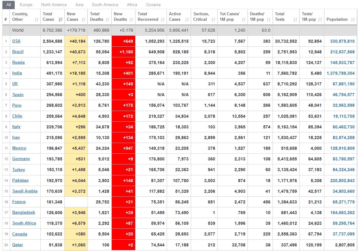 آمار بهروز جهانی درباره کرونا/ سه کشور صدر جدول+ رتبه کشورهای آسیایی