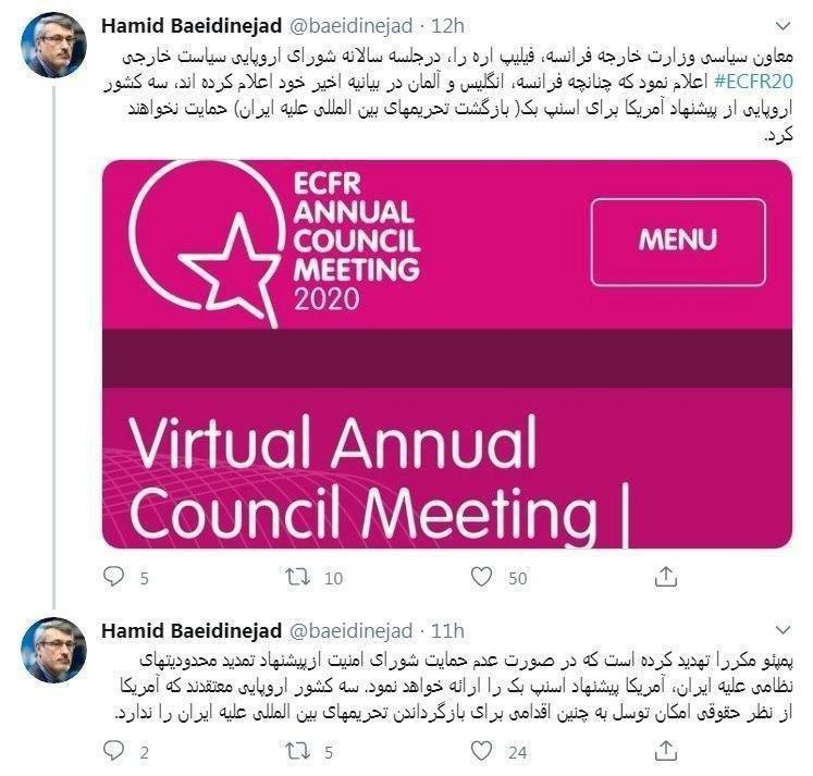 گروه سیاسی الف، 3990410065سفیر کشورمان در لندن در توئیتی نوشت: معاون سیاسی وزارت خارجه فرانسه، در جلسه سالانه شورای اروپایی سیاست خارجی عنوان کرد که براساس آنچه فرانسه، انگلیس و آلمان در بیانیه اخیر خود اعلام کردهاند، سه کشور اروپایی از پیشنهاد آمریکا برای اسنپ بک (بازگشت تحریمهای بینالمللی علیه ایران) حمایت نخواهند کرد.