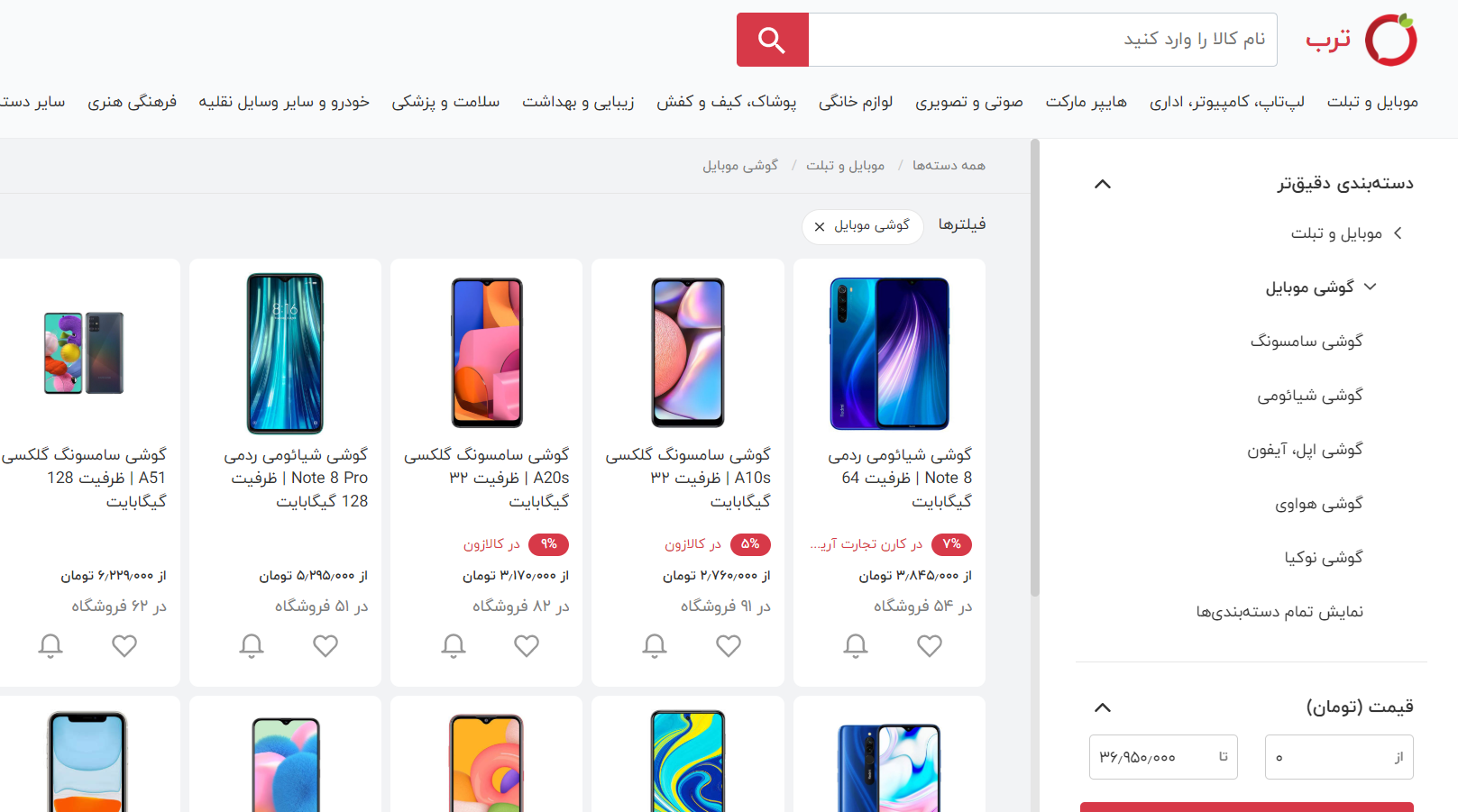 برای مثال از این لینک قیمت گوشیهای سامسونگ را در بین فروشگاههای ترب میتوانید ببینید.