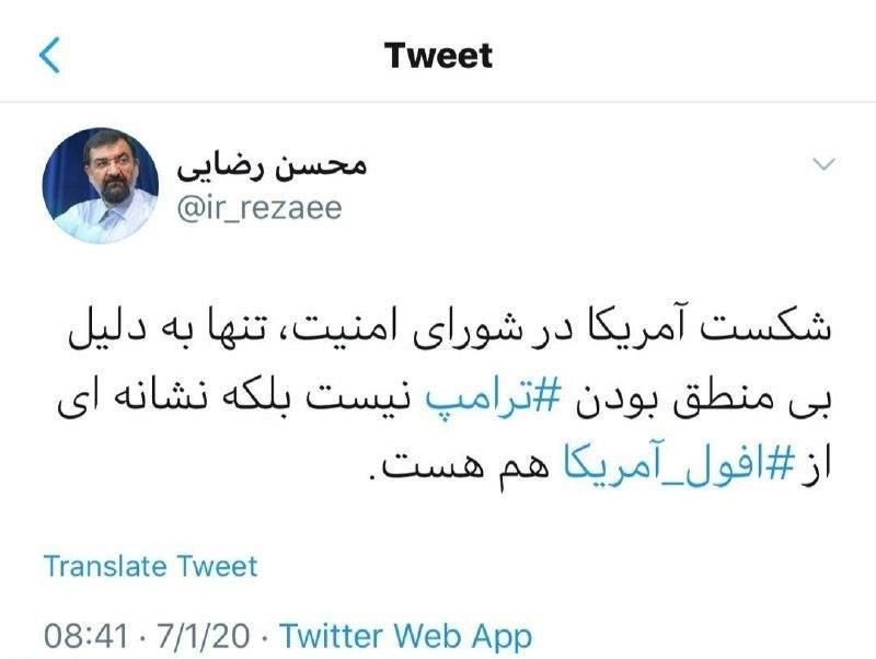 گروه سیاسی الف، 3990411074 ۵ نظر، ۰ در صف انتشار و ۳ تکراری یا غیرقابل انتشارمحسن رضایی، دبیر مجمع تشخیص مصلحت نظام در توئیتی نوشت: شکست آمریکا در شورای امنیت، تنها به دلیل بی منطق بودن ترامپ نیست بلکه نشانه ای از افول آمریکا هم هست.