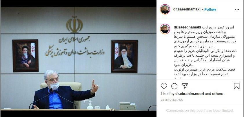 گروه اجتماعی الف، 3990421108وزیر بهداشت، درمان و آموزش پزشکی در صفحه اینستاگرام خود نوشت: امروز عصر در وزارت بهداشت میزبان وزیر محترم علوم و مسئولان سازمان سنجش هستم تا سریعا درباره وضعیت و زمان برگزاری آزمونهای سراسری تصمیمگیری کنیم. دغدغهها و نگرانی داوطلبان عزیز را شنیدم و امیدوارم نتیجه این جلسه باعث برطرف شدن اضطراب و نگرانی چند ماهه این عزیزان شود. قطعا سلامت مردم عزیز مهمترین اولویت تمام تصمیمات ما در وزارت بهداشت است.