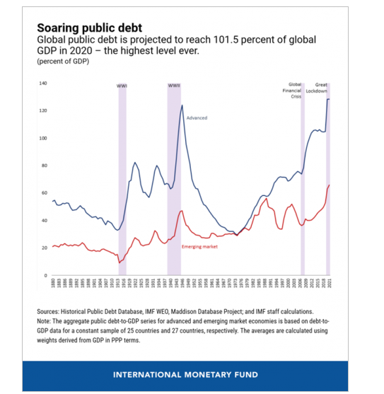 بدهی عمومی در 2020 از همه سالهایی که آمار آن در دست است بیشتر شده و از کل تولید ناخالص داخلی در سطح جهانی گذر کرده است. شکل زیر درصد بدهی کشورهای با اقتصاد پیشرفته و کشورهای با اقتصادهای نوظهور را نشان می دهد. بدهی تجمعی جهانی 101.5 درصد جی دی پی جهانی است. در این منحنی 25 کشور با اقتصاد پیشرفته و 27 کشور با اقتصاد نوظهور در نظر گرفته شده است. در این میان کشورهای درحال توسعه مجبورند که مجددا به سمت گرفتن قرض و وام از کشورهای ثروتمند و یا نهادهای مالی جهانی رو آورند.