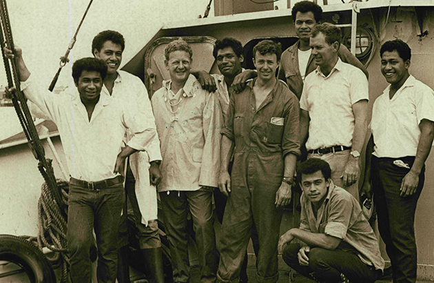 پیتر وارنر، سومین نفر از چپ، همراه با خدمهاش از جمله نجاتیافتگان آتا، در سال ۱۹۶۸. عکاس: جان ریموند.