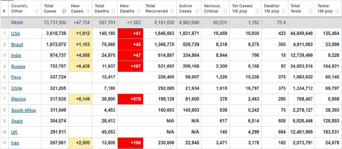 آخرین آمار مبتلایان کرونا در جهان در ۲۶ تیر+ تفکیک کشورها