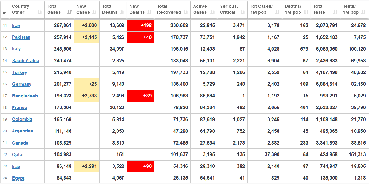 گروه سلامت الف، 3990426127این روزها ویروس کرونا در اغلب کشورهای جهان در حال گسترش است و تکاپویی جهانی برای کنترل آن شکل گرفته است. شما می توانید هر روز در جدول زیر روند ابتلا به این بیماری و بهبود آن را در کشورهای مختلف ببینید. جدول زیر آمار منتشر شده تا روز ۲۶ تیر است.