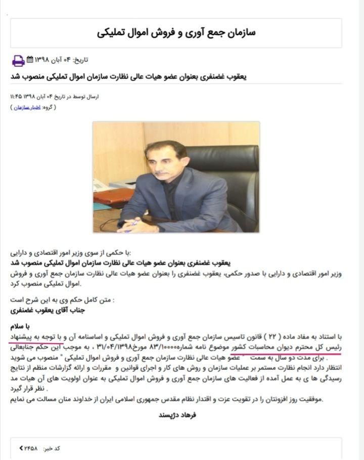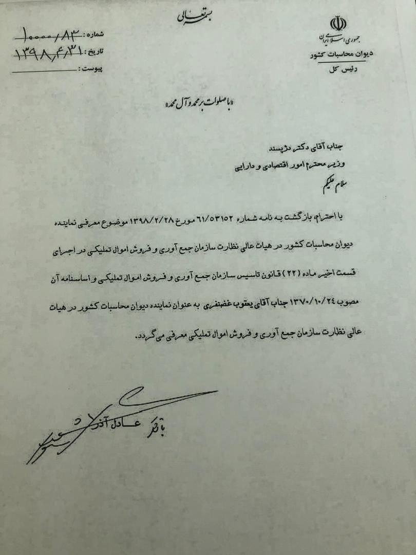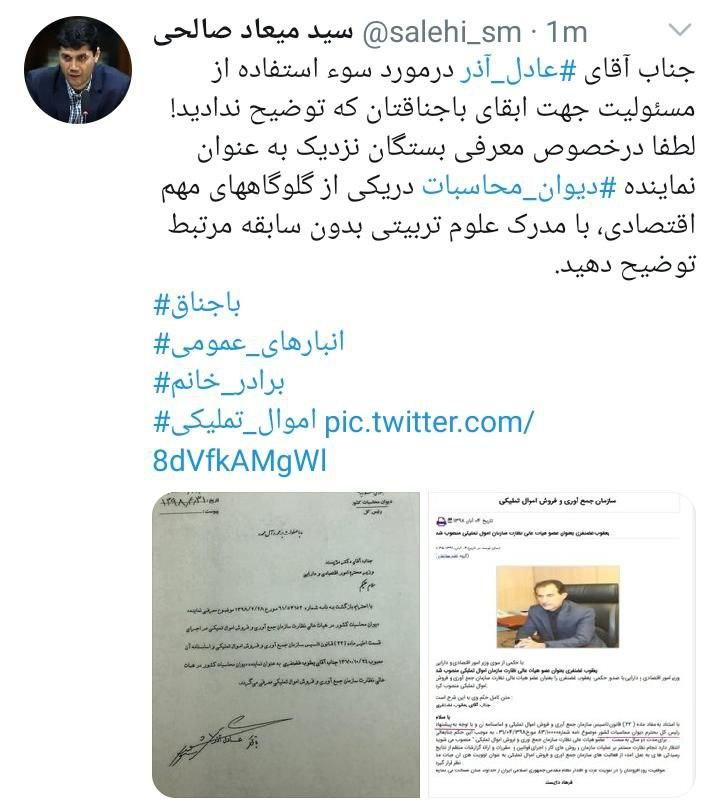 به گزارش الف روز گذشته سید میعاد صالحی رییس سابق صندوق بازنشستگی کشوری با انتشار تويیتی به انتصاب یکی از نزدیکان آقای عادل آذر رییس دیوان محاسبات تو سط وی اعتراض و خواستار توضیحات بیشتر شد . وی در این توییت اسنادی را نیز منتشر میکند که که نشان دهنده معرفی آقای یعقوب غضنفری به عنوان نماینده دیوان محاسبات در هیات عالی نظارت سازمان جمع آوری و فروش اموال تملیکی به وزیر اقتصاد است .