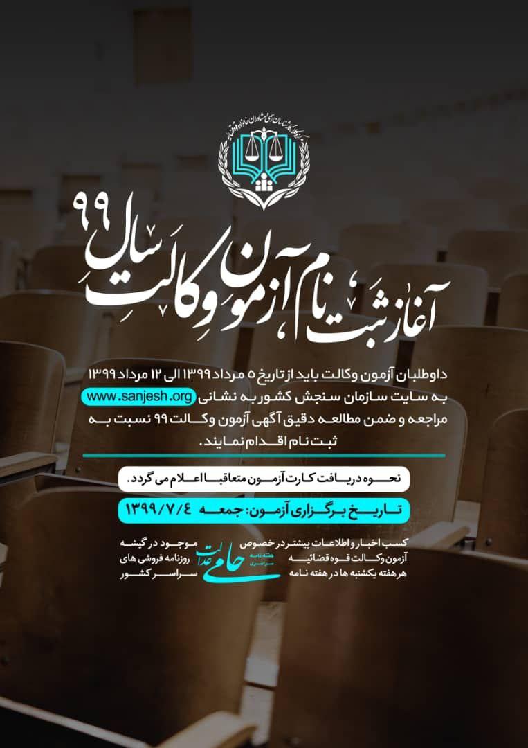 علاقه مندان به شرکت در این آزمون می توانند با مراجعه به پایگاه sanjesh.org ضمن مطالعه دقیق آگهی آزمون وکالت ۹۹ نسبت به ثبت نام اقدام نمایند؛ نحوه دریافت کارت آزمون نيز متعاقبا اعلام می گردد.