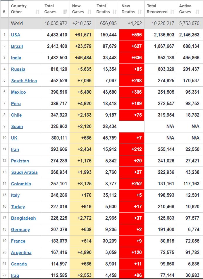 گروه سلامت الف، 3990507028این روزها ویروس کرونا در اغلب کشورهای جهان در حال گسترش است و تکاپویی جهانی برای کنترل آن شکل گرفته است. شما می توانید هر روز در جدول زیر روند ابتلا به این بیماری و بهبود آن را در کشورهای مختلف ببینید. جدول زیر آمار منتشر شده تا روز ۷ مرداد است.