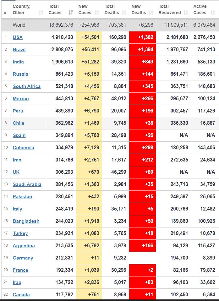 آمار بهروز جهانی درباره کرونا/ آمریکا در آستانه ۵ میلیون مبتلا