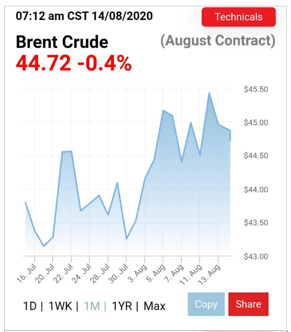 قیمت نفت در روز جمعه 24 مرداد ماه 1399 مجددا به کمتر از 45 دلار هربشکه کاهش یافت. نفت خام برنت دریای شمال به 44.72 دلار هر بشکه رسید. نفت وست تگزاس اینترمدییت با نیم درصد کاهش به 42.07 دلار بر هر بشکه بفروش رفت. از دلایل آن می تواند شیوع مجدد و بالارفتن تلفات در اکثر کشورها به دلیل بیماری کووید-19، بالا رفتن مقدار عرضه، و احتمال ضعیف شدن محرک های اقتصادی در آمریکا باشد.