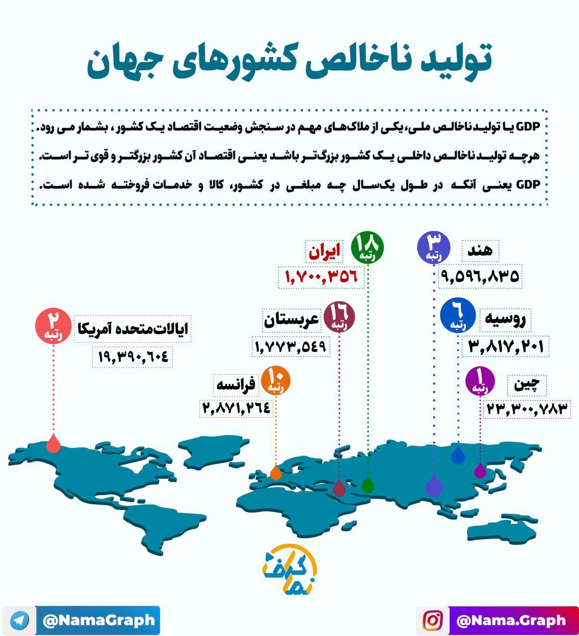 تولید ناخالص کشورهای جهان گروه عکس الف، ۲۸ مرداد ۱۳۹۹، ۱۵:۳۳ 3990528113 با توجه ظرفیت عظیم منابع طبیعی در کشور به نظر میرسد استفاده از این منابع اولاً میتواند موجب ارتقای رتبه ایران در میان سایر کشورها شود و همچنین اقتصاد کشور نیز از این مسیر بهبود پیدا کند.