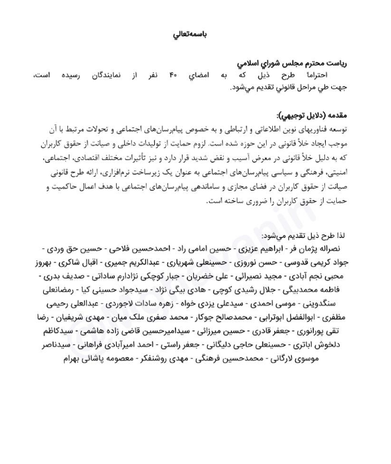 به گزارش خبرگزاری برنا؛ صیانت از حقوق کاربران در فضای مجازی و ساماندهی پیام رسانههای اجتماعی به امضای ۴۰ نفر از نمایندگان رسیده و برای طی مراحل قانونی به ریاست مجلس شورای اسلامی تقدیم شد.