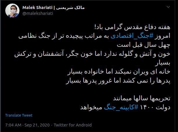 گروه سیاسی الف، 3990631120مالک شریعتی نماینده مردم تهران در مجلس شورای اسلامی در توئیتی نوشت: امروز جنگ اقتصادی به مراتب پیچیدهتر از جنگ نظامی چهل سال قبل است. تحریمها سالها میمانند؛ دولت ۱۴۰۰ کابینه جنگی میخواهد.