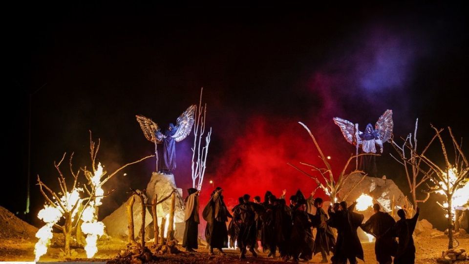 محشر، نام نمایشی میدانی است که با موضوعی متفاوت به روی صحنه رفته است. این نمایش روایت زندگی مردی است که بر اثر حادثه از دنیا می رود و پا به عالم برزخ می گذارد و پردههایی از آن سوی مرگ را مشاهده میکند. نمایش محشر به کارگردانی و نویسندگی صادق فتاحی و تهیهکنندهگی سازمان رسانهای اوج هر شب در پارک ارم تهران اجرا می شود. عکس: مهدیه کرمانی/ فارس