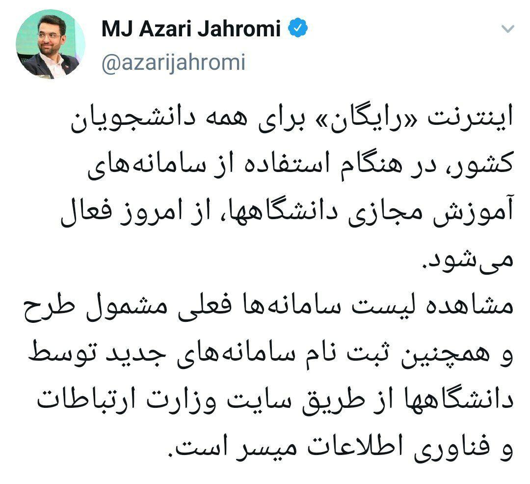 3990714067آذری جهرمی وزیر ارتباطات در توئیتی اعلام کرد: اینترنت همه دانشجویان برای استفاده از سامانههای آموزش مجازی، «رایگان» شد.