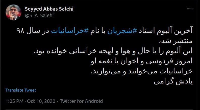 صالحی وزیر فرهنگ و ارشاد اسلامی در توئیتی نوشت: آخرین آلبوم استاد محمدرضا شجریان با نام «خراسانیات» در سال ۱۳۹۸ منتشر شد. امروز فردوسی و اخوان با نغمه او خراسانیات میخوانند و مینوازند.
