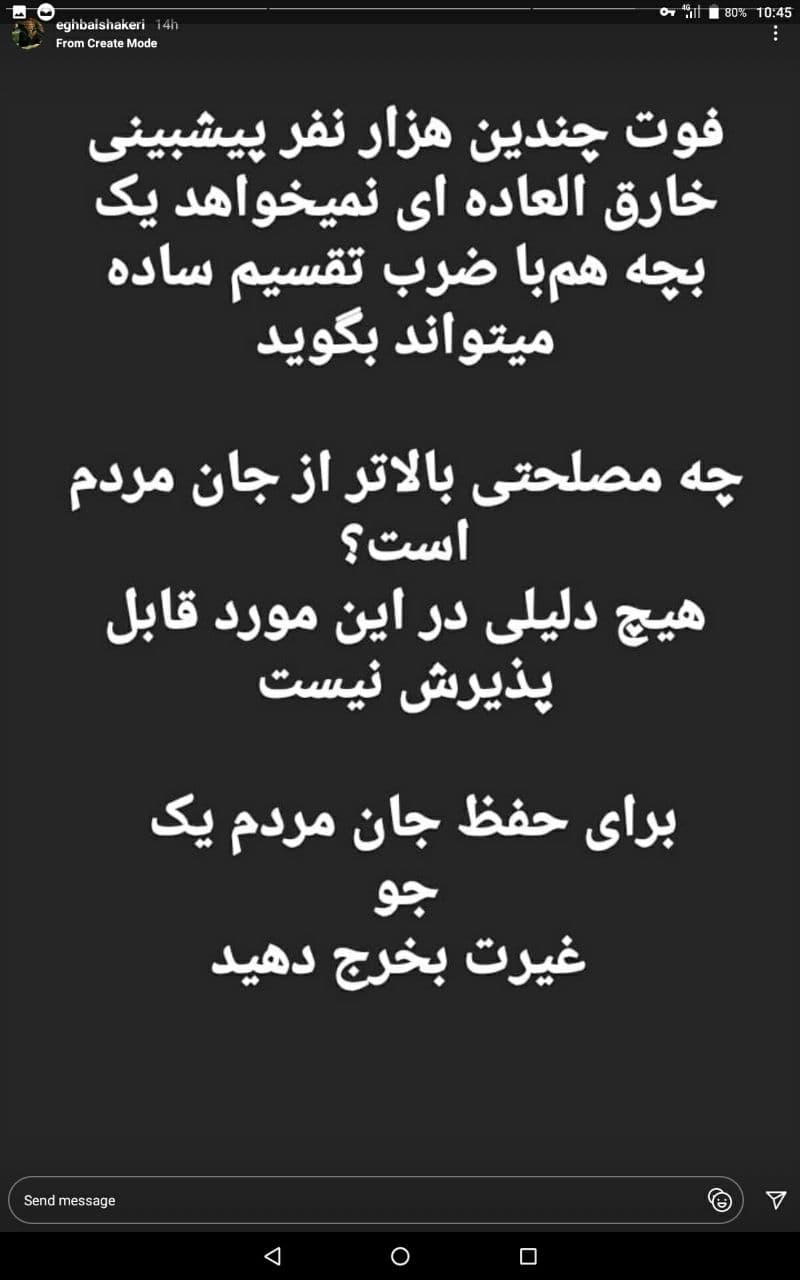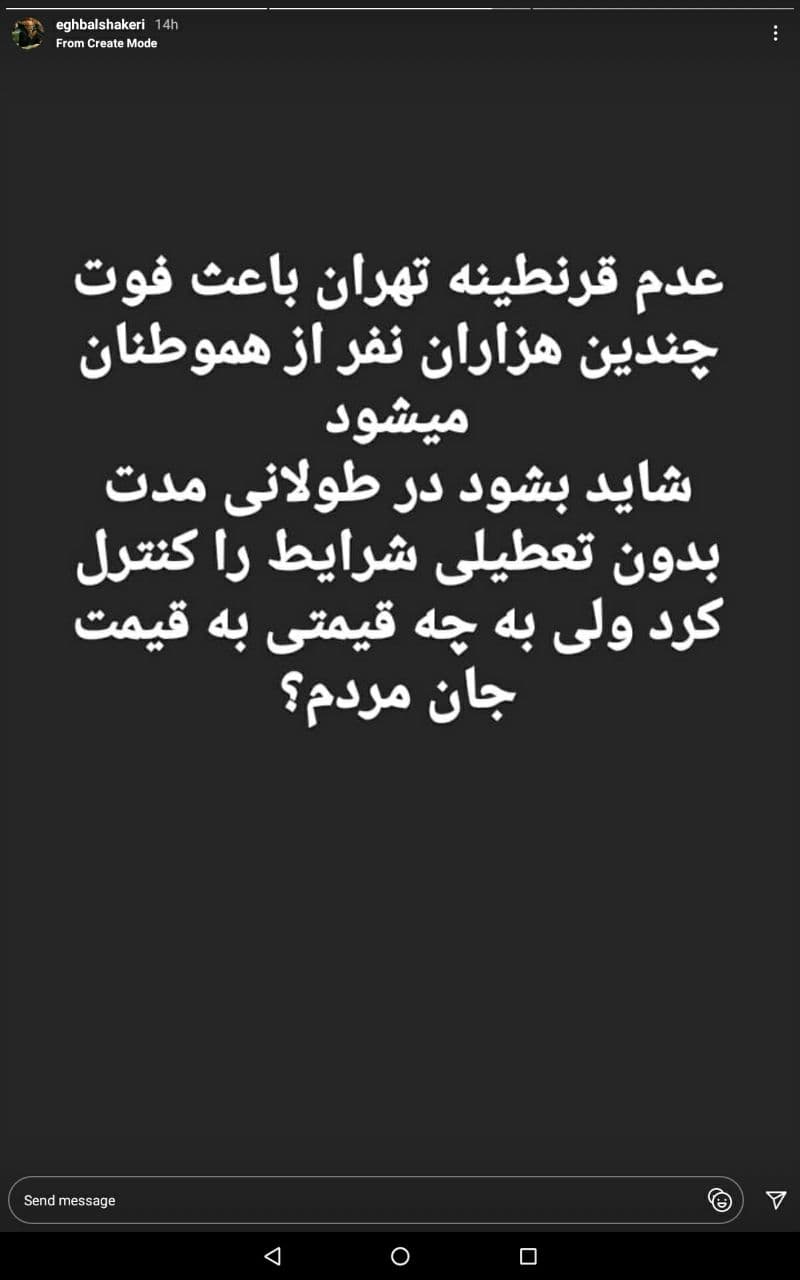 گروه اجتماعی الف، 3990820039 ۱ نظر، ۰ در صف انتشار و ۰ تکراری یا غیرقابل انتشاراقبال شاکری نماینده مجمع نمایندگان تهران در ستاد کرونا در استوری اینستاگرام خود نوشت: «فوت چندین هزار نفر پیش بینی خارق العادهای نمیخواهد یک بچه هم با ضرب و تقسیم ساده میتواند بگوید. چه مصلحتی بالاتر از جان مردم است. هیچ دلیلی در این مورد قابل قبول نیست. برای حفظ جان مردم یک جو غیرت به خرج دهید.»
