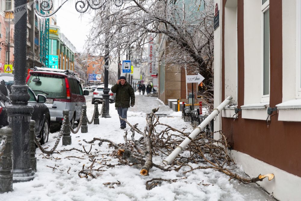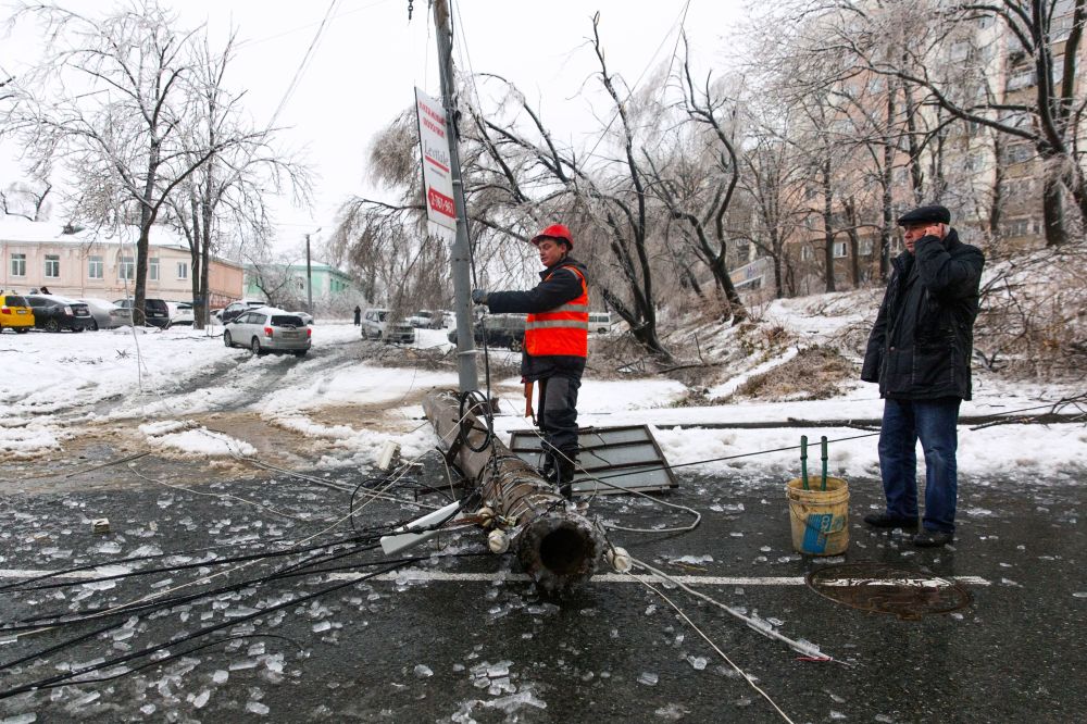 گروه عکس الف، 3990903026طوفان و یخبندان گسترده که شهر "ولادیوستوک" در شرق روسیه را دربرگرفته، باعث شده است هزاران نفر از ساکنان این شهر، روزها را بدون آب و برق سپری کنند و در این منطقه وضعیت اضطراری اعلام شود. کاهش کمسابقه دمای هوا در این منطقه باعث شکسته شدن درختان و از کار افتادن خطوط انتقال برق شده است.