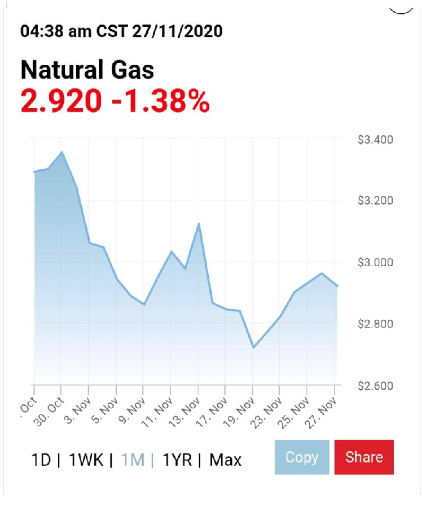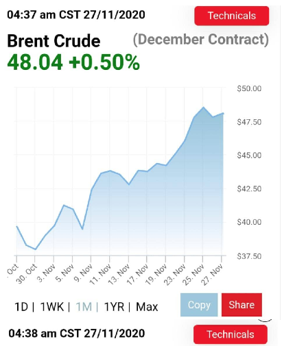 در روز جمعه قیمت نفت مانند سه هفته قبل با افزایش براه خود ادامه داد. نفت برنت برای تحویل در ماه دسامبر در بازار لندن به 48 دلار هر بشکه رسید، گرچه چند روز قبل به 49 دلار هم رسیده بود. قیمت نفت تگزاس گرچه به 46 دلار هر بشکه هم رسید، اما هنوز هم از قیمت ابتدای سال یعنی اول ژانویه 2020 که حدود 60 دلار هر بشکه بود، پایین تر است. قیمت گاز طبیعی هم نسبت به هفته قبل بالاتر رفته و به 2.9 دلار هر میلیون بی تی یو در بازار هنری هاب رسید.