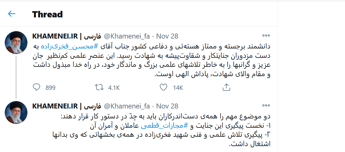 «دانشمند برجسته و ممتاز هستهئی و دفاعی کشور جناب آقای محسن فخریزاده به دست مزدوران جنایتکار و شقاوتپیشه به شهادت رسید. این عنصر علمی کمنظیر جان عزیز و گرانبها را به خاطر تلاشهای علمی بزرگ و ماندگار خود، در راه خدا مبذول داشت و مقام والای شهادت، پاداش الهی اوست. »