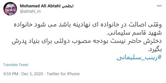 گروه سیاسی الف، 3990916019 ۹ نظر، ۰ در صف انتشار و ۲ تکراری یا غیرقابل انتشارمحمدعلی ابطحی فعال سیاسی اصلاحطلب، در واکنش به اقدام زینب سلیمانی در رد بودجه دولت برای بنیاد شهید سلیمانی طی توئیتی نوشت: «وقتی اصالت در خانواده ای نهادینه باشد می شود خانواده شهید قاسم سلیمانی. دخترش حاضر نیست بودجه مصوب دولتی برای بنیاد پدرش بگیرد.»