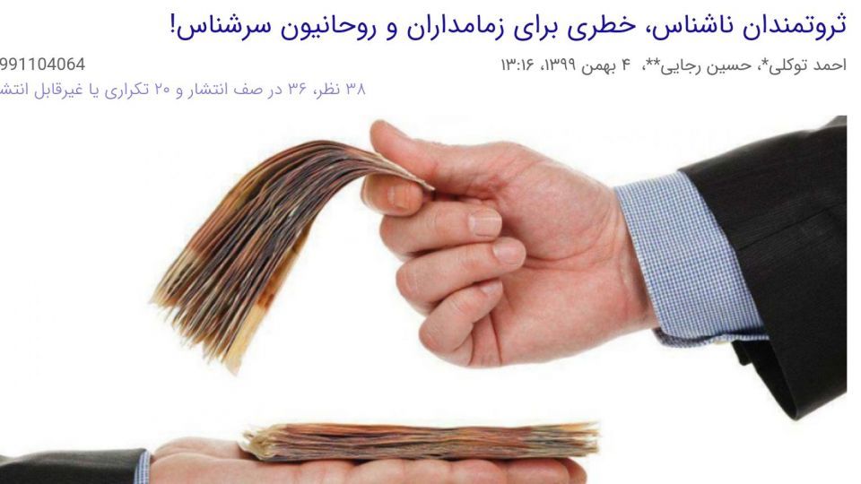 آقای توکلی علما را هشدار داده است که « افرادی در لباس تاجران خیّر و متدیّن به دنبال نفوذ بر علما و مسئولان هستند…. طبیعی است که علما و روحانیون به ثروتمندان خیّر حسن ظن داشته باشند یا آن ها را بستایند. اما چه کنیم وقتی قلیلی از این ثروتمندان بدین طریق برای خود وجهه و اعتبار کسب می کنند و از آن برای کسب مقاصدی غیرقانونی و نامشروع سود می جویند!؟ چه کنیم وقتی همواره عده ای با مقاصد سیاسی و اقتصادی خاص به دنبال نفوذ در بیوت علما بوده اند و تاریخ نشان داده که بعضا هم موفق شده اند!؟»