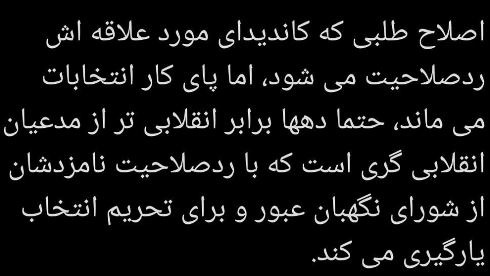 اصلاح طلبی که کاندیدای مورد علاقه اش ردصلاحیت می شود، اما پای کار انتخابات می ماند، حتما دهها برابر انقلابی تر از مدعیان انقلابی گری است که با ردصلاحیت نامزدشان از شورای نگهبان عبور و برای تحریم انتخاب یارگیری می کند.