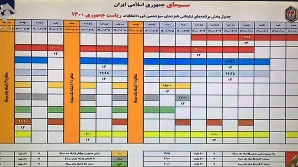 در ادامه تصویر جدول پخش برنامه های تبلیغاتی کاندیداها در تلویزیون و رادیو قایل مشاهده است: