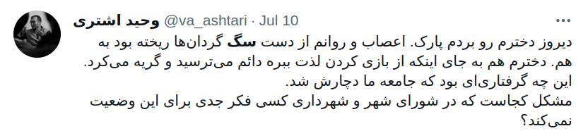 متاسفانه با وجود تمام این چالشها، روز گذشته خبری از شورای پنجم شهر تهران مخابره شد که بر اساس مصوبه آن شورا، صرفا سگگردانی در محل بازی کودکان در بوستانهای پایتخت ممنوع است و همچنان پارکها برخلاف قانون شاهد حضور افرادی که علاقه به سگگردانی دارند، خواهند بود.