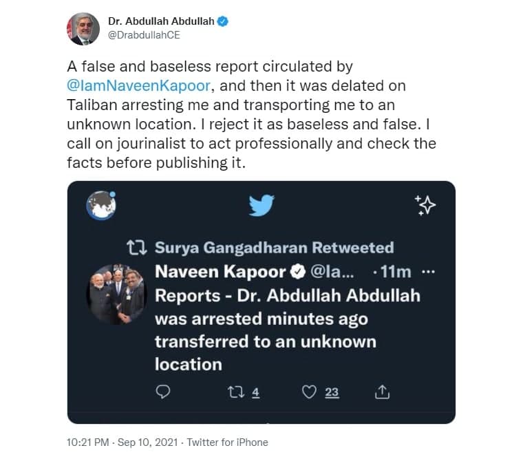 «عبدالله عبدالله» رئیس شورای عالی مصالحه ملی افغانستان در دولت «اشرف غنی»، خبر بازداشت خود و انتقال به مکانی نامعلوم توسط طالبان را که توسط یک خبرنگار هندی منتشر شده بود، تکذیب کرد.
