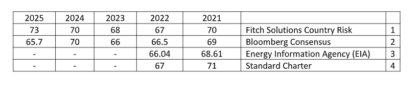 6- شرکت رتبه بندی ریسک فیچ در آخرین گزارش خود پیش بینی کرده است که تولید ناخالص داخلی (GDP) بصورت متوسط در سطح جهانی در 2021، 5.7 درصد و در 2022 مقدار 4.2 درصد نسبت به سال قبل رشد خواهد داشت. به دلیل رشد استفاده از انرژی های پاک پیش بینی می شود که مقدار تقاضا برای انرژی های فسیلی بخصوص نفت خام در 2022 از 2021 کمتر بوده و به همین دلیل قیمت نفت خام نیز کمتر پیش بینی می شود. جدول زیر آخرین پیش بینی ها از قیمت نفت توسط برخی از شرکت های مشاوره ای و آژانس های دولتی است. همان طور که ملاحظه می شود پیش بینی قیمت ها در همه تخمین ها از 75 دلار بالاتر نیست. یعنی قیمت نفت خام فعلی از نظر کارشناسان نمی تواند در دراز مدت پایدار باقی بماند.
